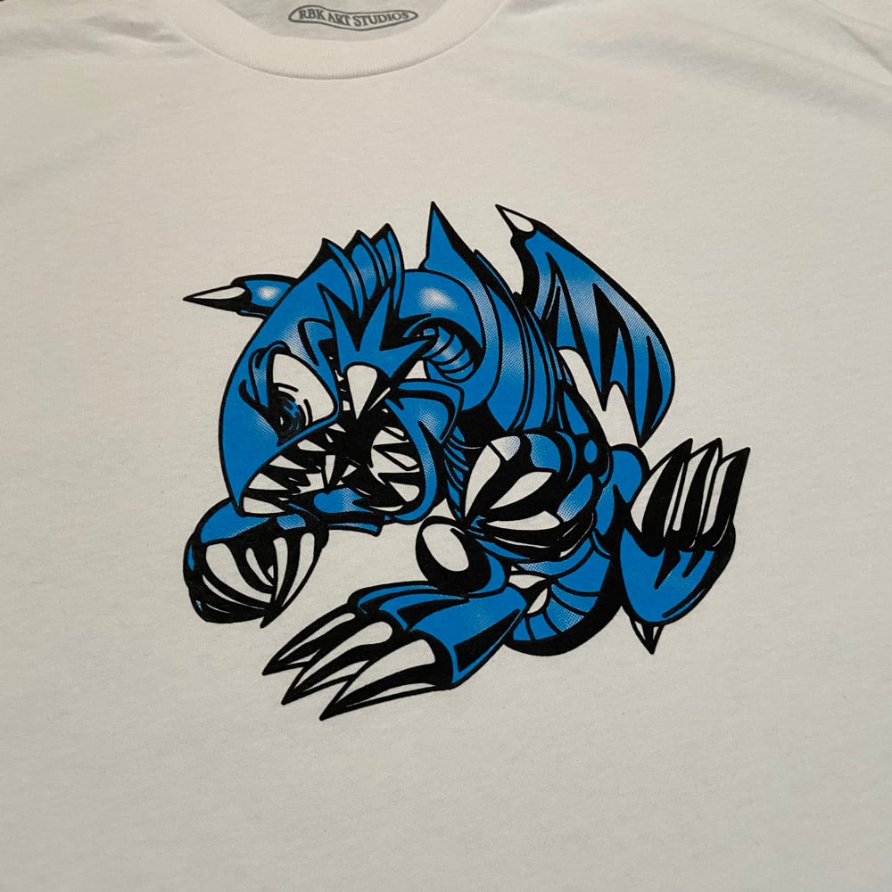 2 color screen print of a blue eyes toon dragon from Yu-GI-Oh