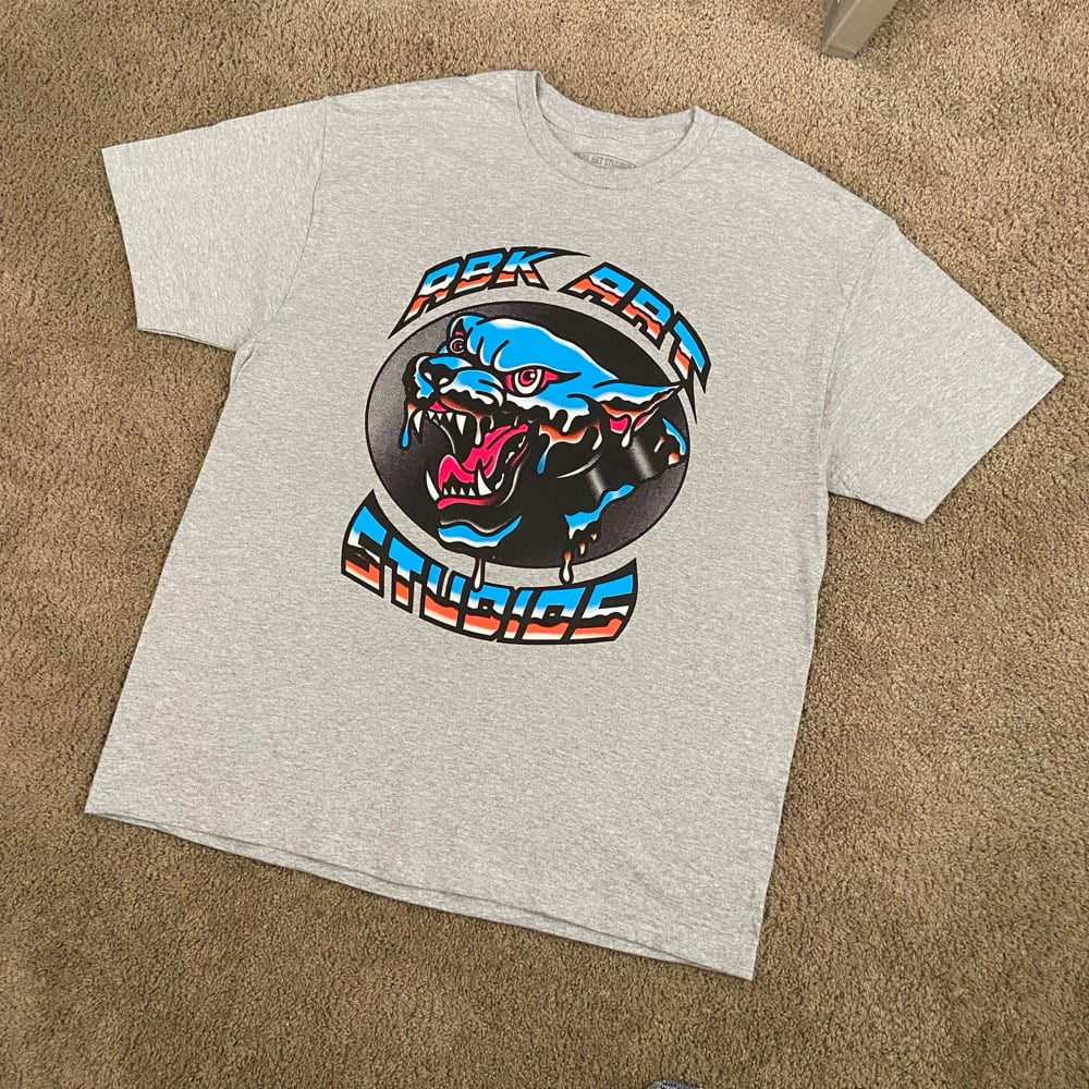 5 color graphic screen printed by hand with plastisol ink on 6.5oz heavy weight 100% cotton tees